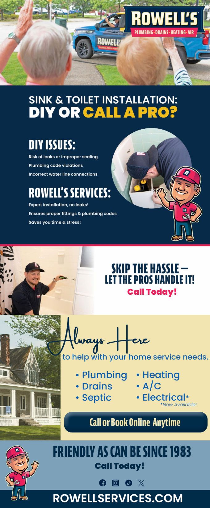 "Friendly As Can Be Since 1983!" When you need help with your plumbing, drains, heating, cooling or electrical in Bethlehem, you can always rely on Rowell's Services! Call us now or book online!
